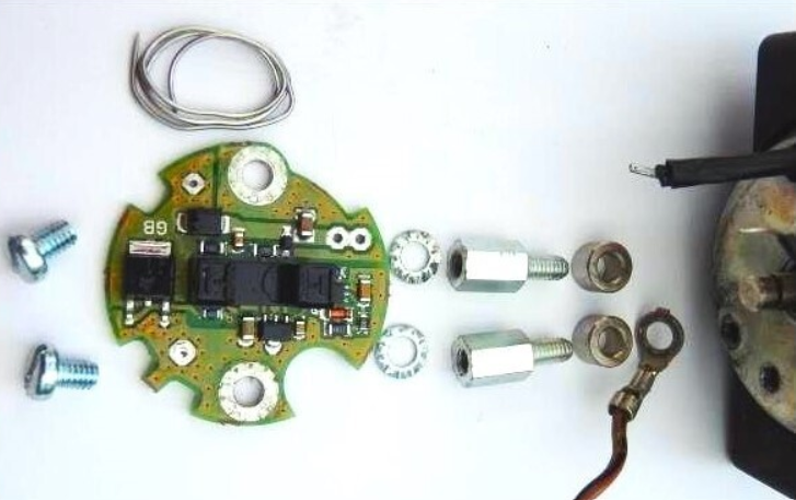 The complete contact breaker assembly is removed and replaced by a small PCB (specially designed by me to fit into the housing).